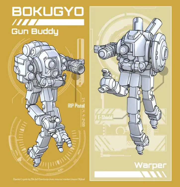 Variations on these drones can ordinarily be seen in mundane civilian employ at stations doing external maintenance and monitoring tasks. However, for combat roles the “gun buddy” variants of Bokugyo are fitted with a modified RIP pistol mounted flexibly on the external casing of the pod.