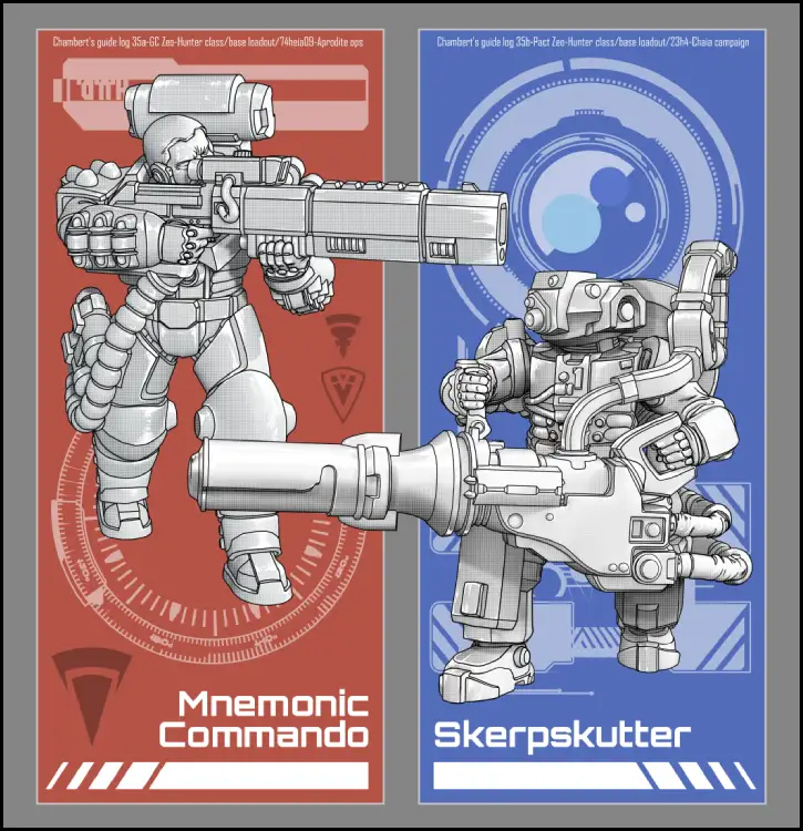 In the anti-zeoform role, commandos are supplied data-chips with precise renditions of zeoform schematics of all known types and information on disabling them rendered at an instinctual level, in addition to standard chipsets for combat awareness, weapons handling, reflex enhancement, and emotional bypass. Even with superhuman reflexes, the mobile light Support armor used by Commandos lacks sufficient protection for confrontations with combat zeoforms, so image- and sensor-absorbing materials and signature-scatter generators are common additions to provide sufficient stealth capabilities for a first strike. For weapons, Commandos employ standard SCL-64 Launchers and the more exotic SAZ-19 Heavy Rifle, an approximation of the Pact’s AZ Lance.