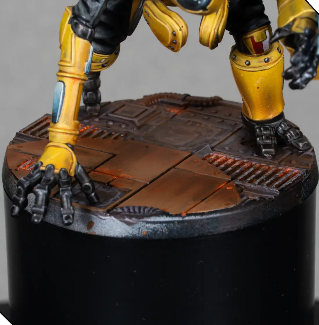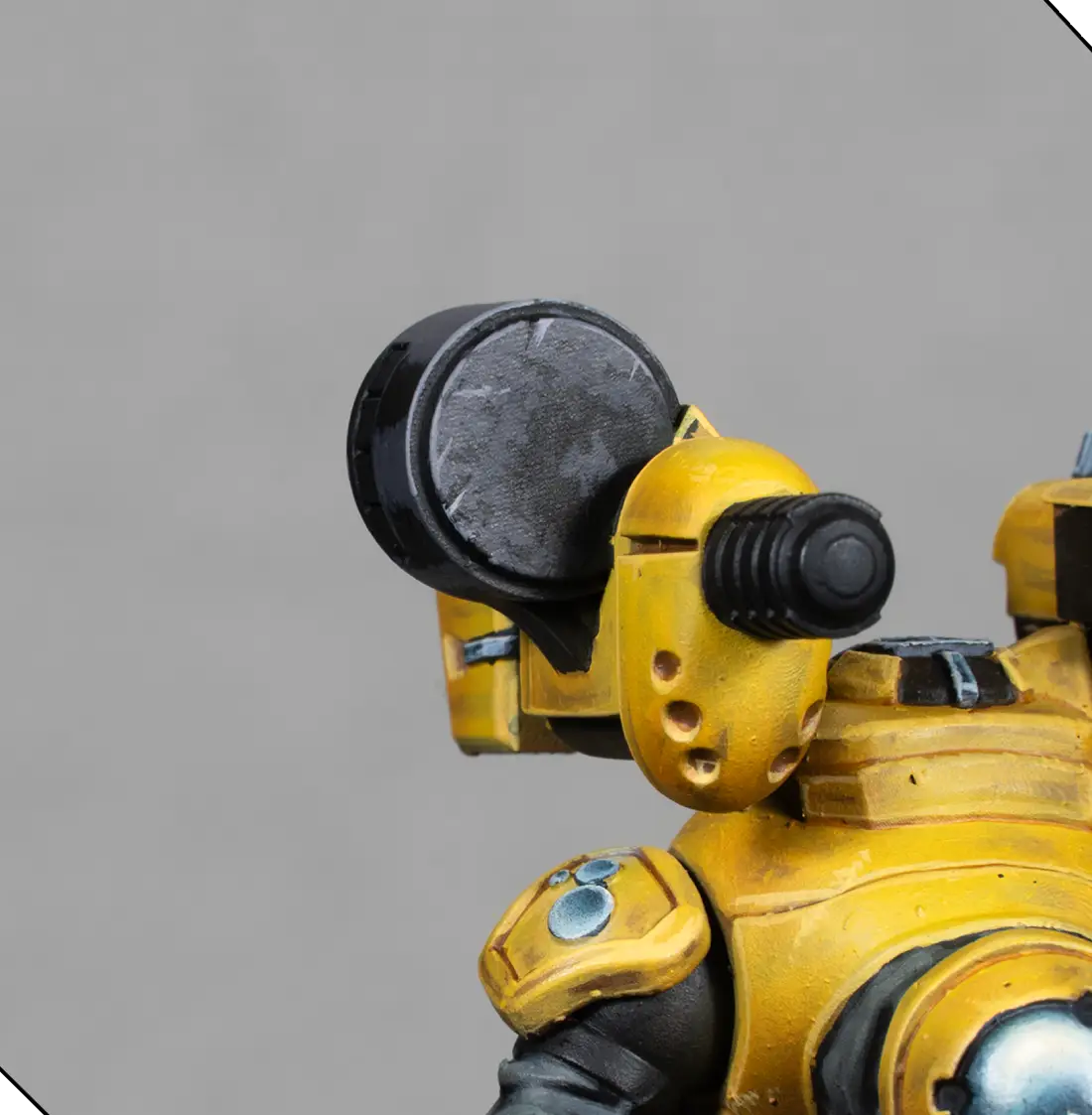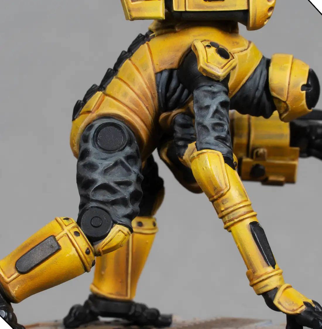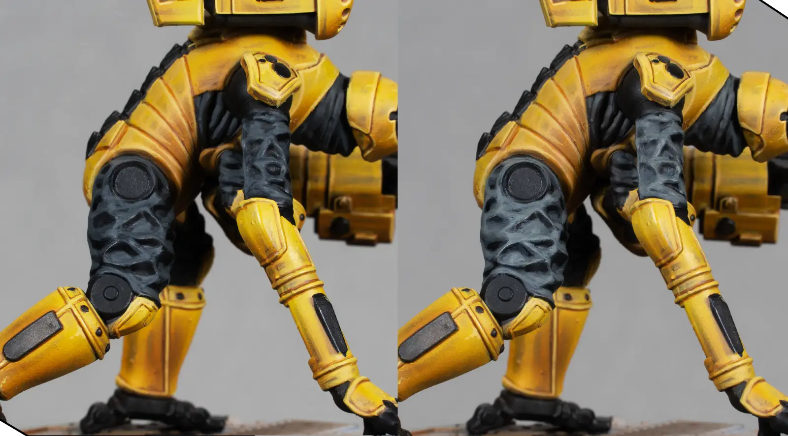 I mix 70% Flash Gitz Yellow with 30% Pale Sand to create a bright highlight color. With this, I edge-highlight all the armor plates and add a few tiny scratches and chips. This must be very subtle—just enough to add texture without making the armor look dirty.