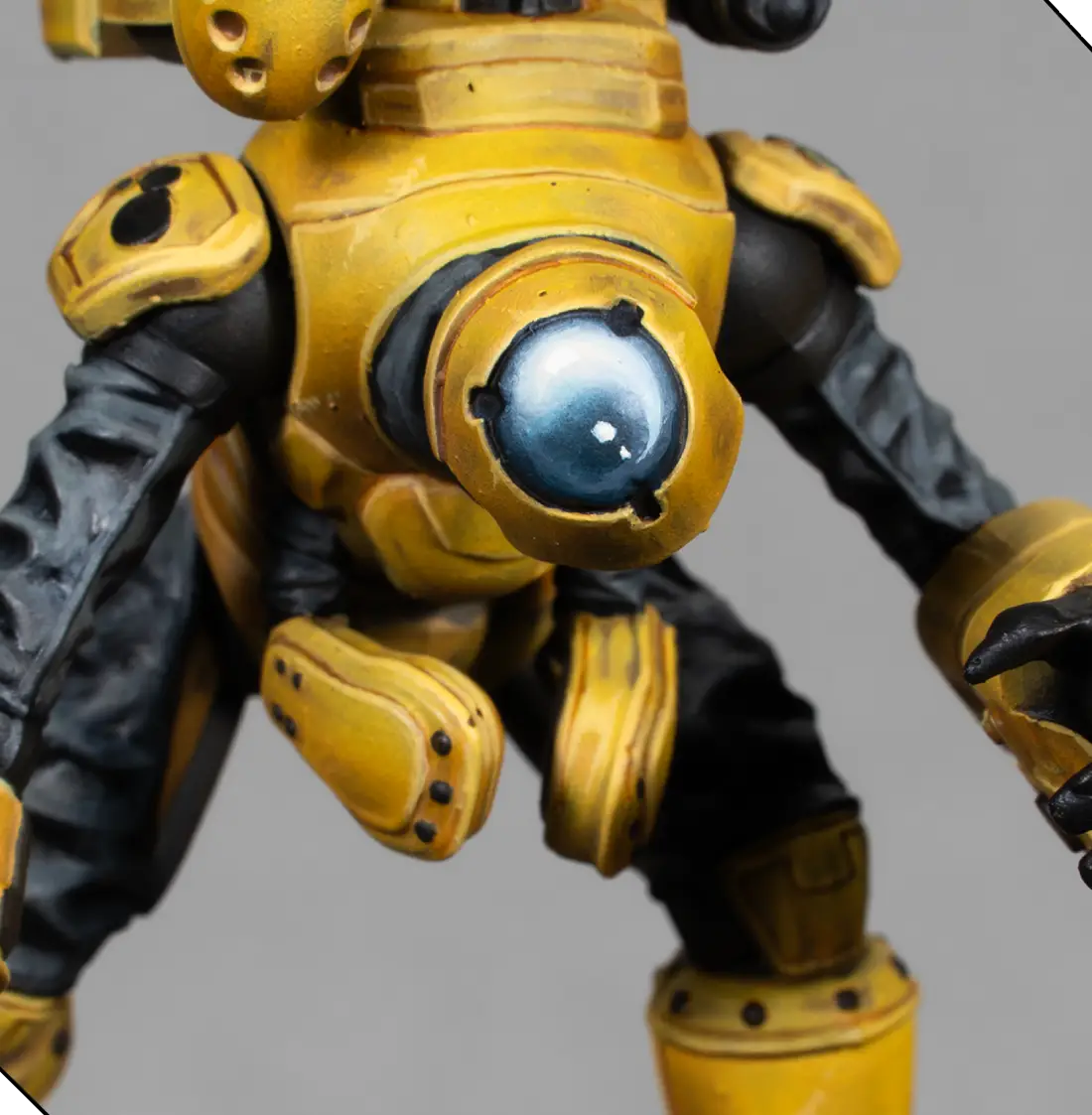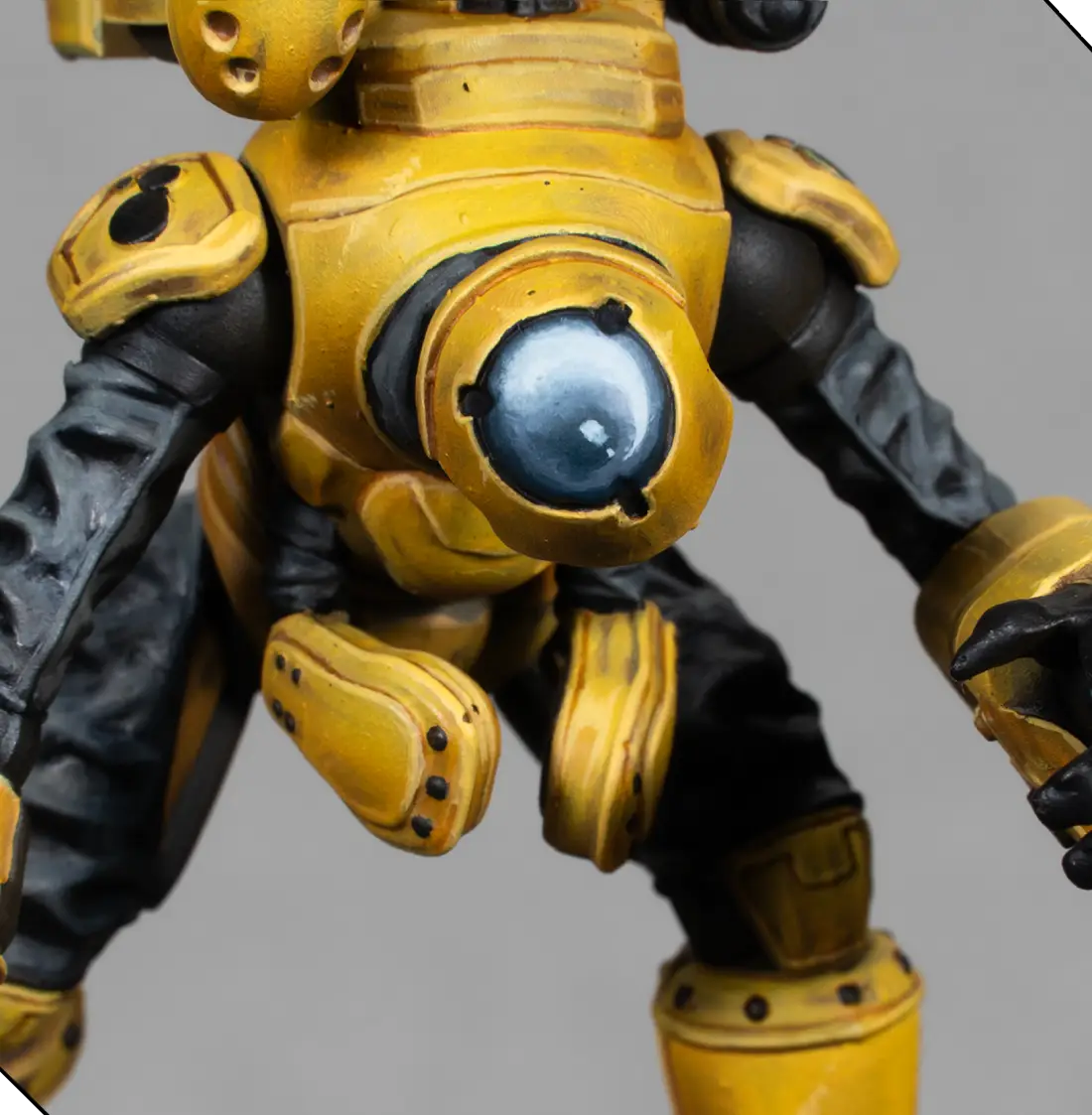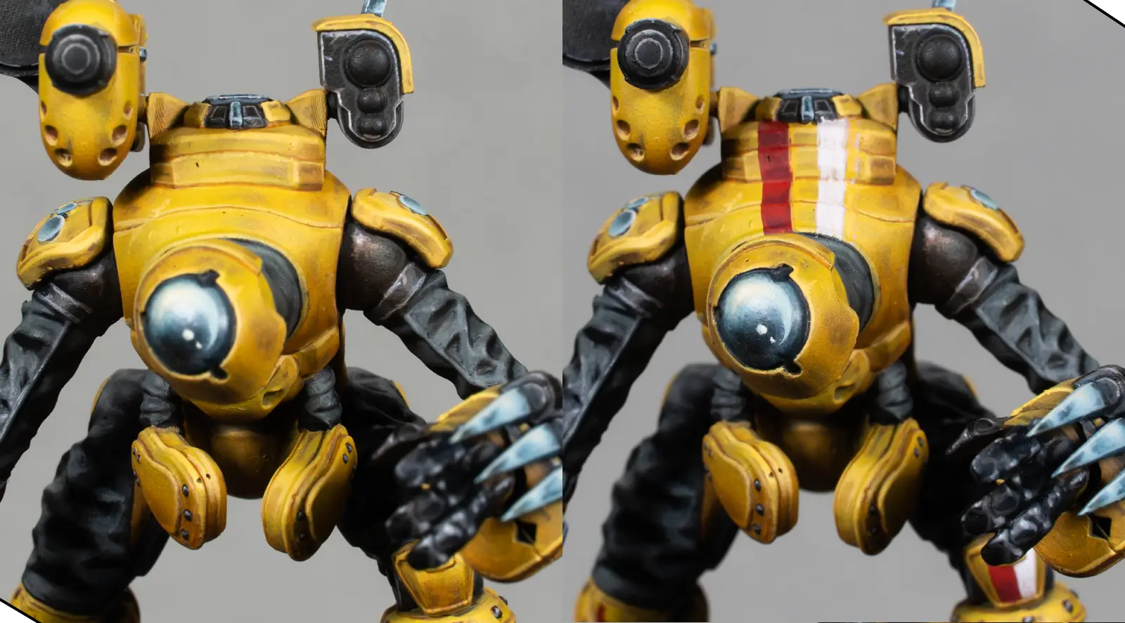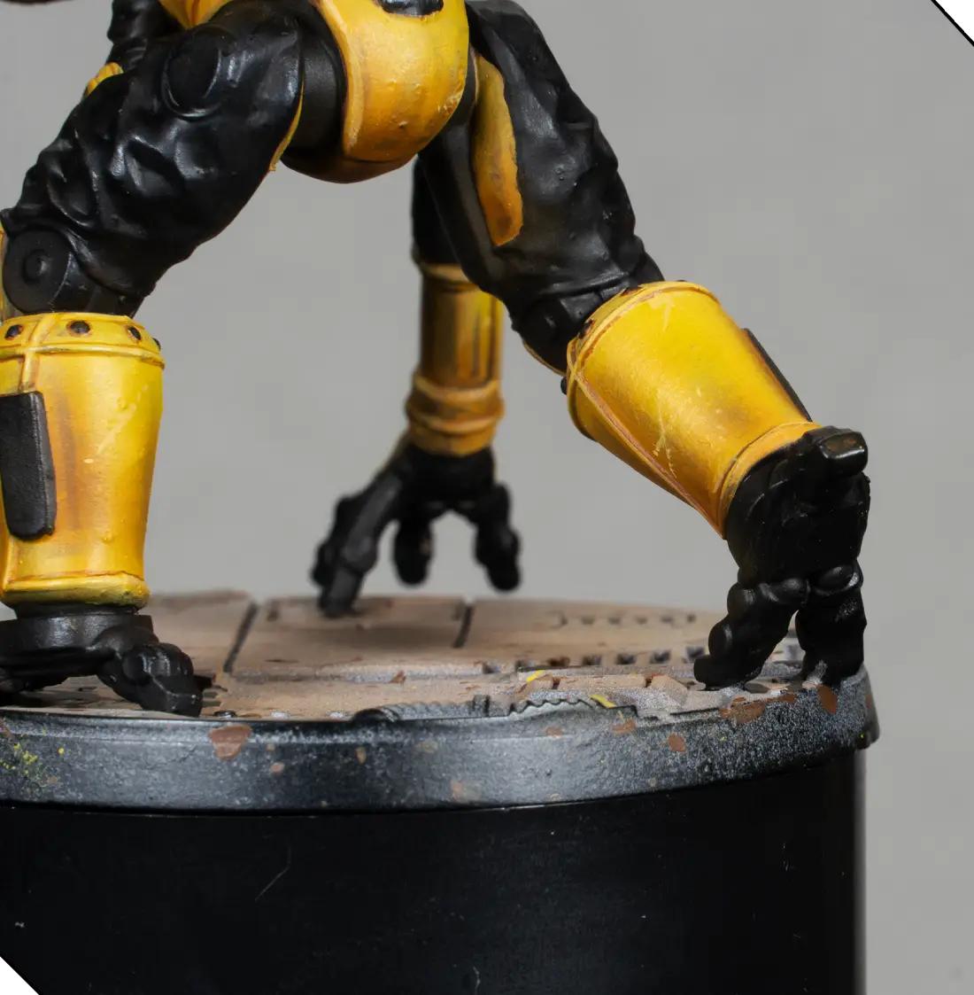 I mix 70% Flash Gitz Yellow with 30% Pale Sand to create a bright highlight color. With this, I edge-highlight all the armor plates and add a few tiny scratches and chips. This must be very subtle—just enough to add texture without making the armor look dirty.
