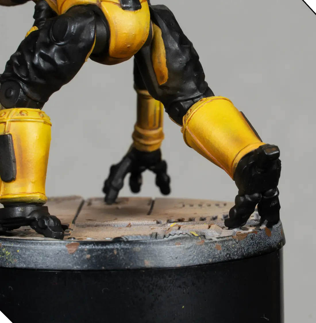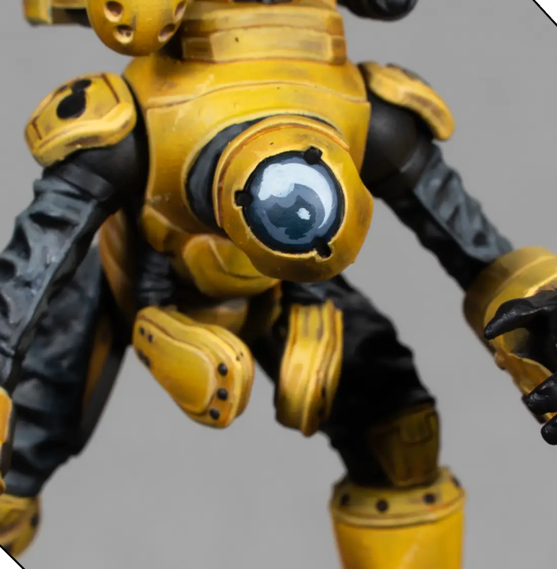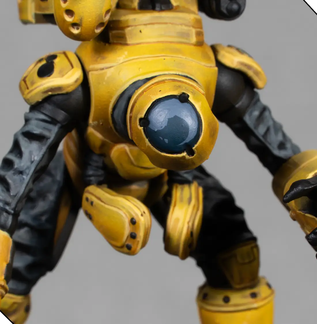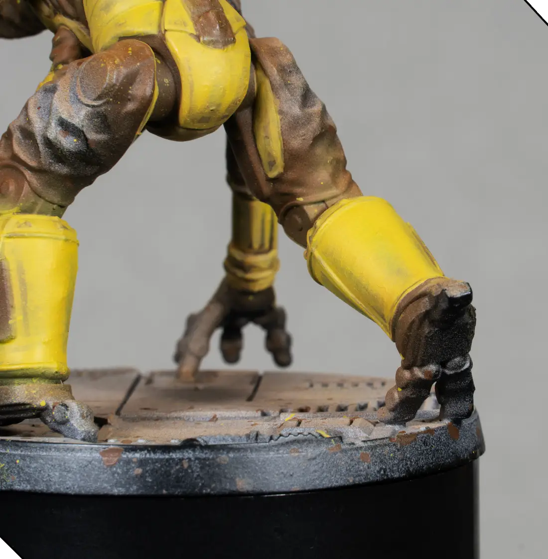 I mix 70% Flash Gitz Yellow with 30% Pale Sand to create a bright highlight color. With this, I edge-highlight all the armor plates and add a few tiny scratches and chips. This must be very subtle—just enough to add texture without making the armor look dirty.
