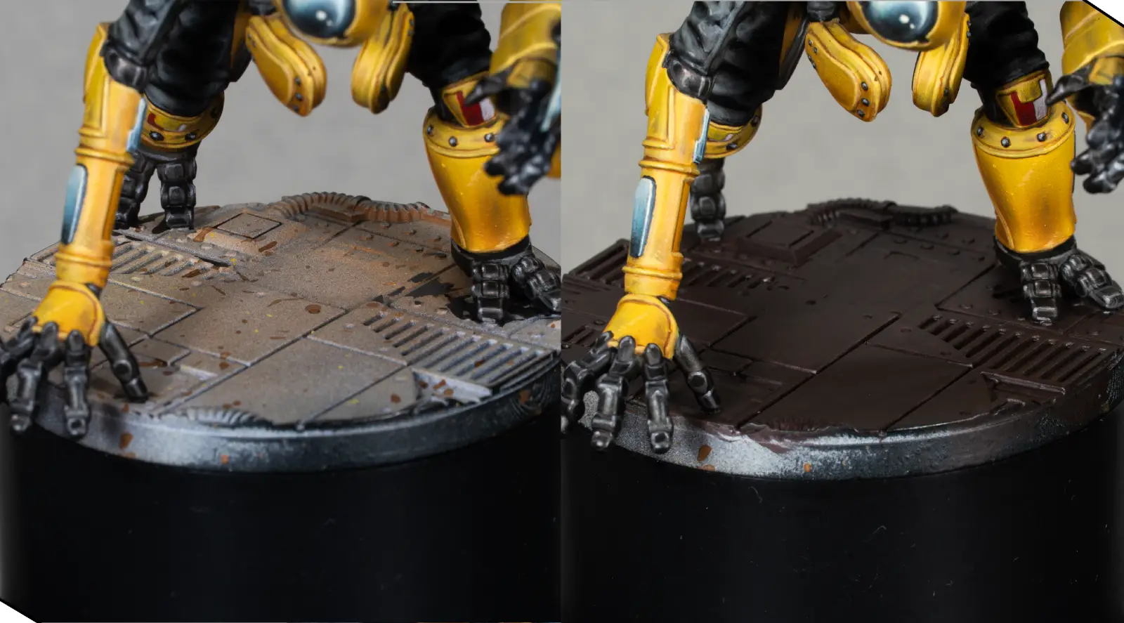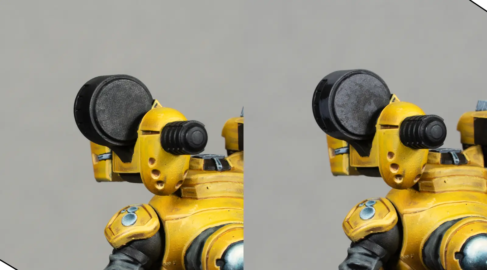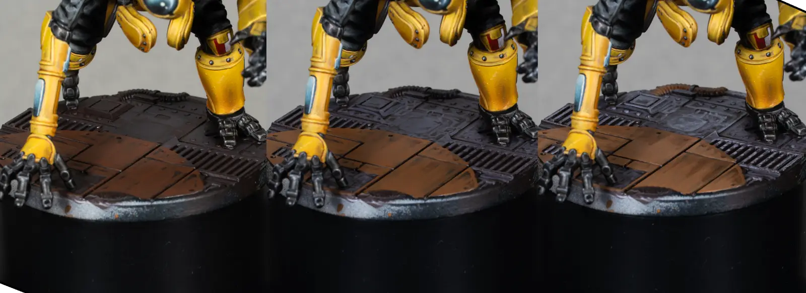 For the corrugated black suit material, I start from the existing black and mix in a bit of Faded Green to create a greenish grey. This contrasts nicely with the warm yellow armor.