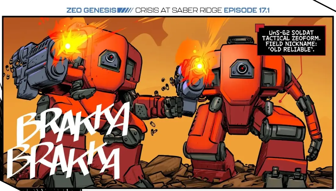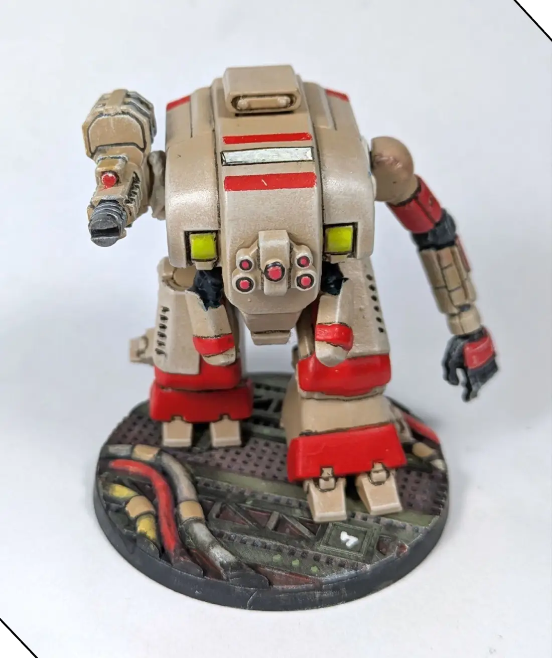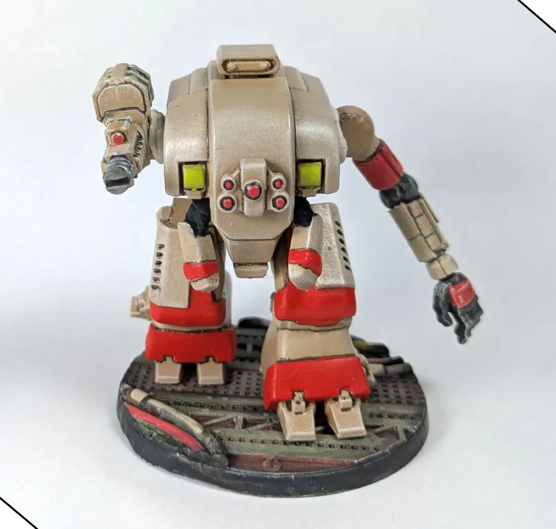 The Soldat Tactical Zeoform is extremely common in backwater garrison postings and second line units, and they’re featured in the webcomic hauling cargo, making it perfect for my vision of a heavily weathered utility vehicle. The standard Soldat loadout is a utility arm on one side and a configurable weapons gimbal on the opposite side of the hull, and I chose the assault rifle. Inspired by the Soldats in the rules and the webcomic, I decided to include red accents to give the model some zazz, but painted it desert tan to help blend into the webcomic environment.