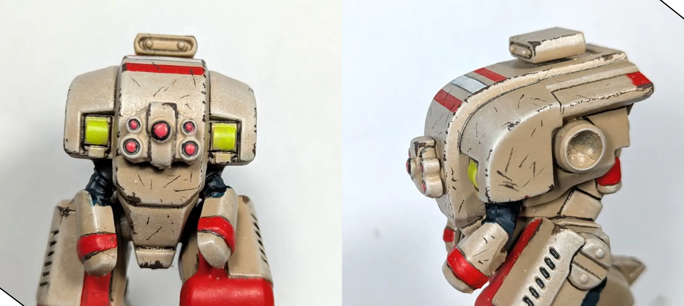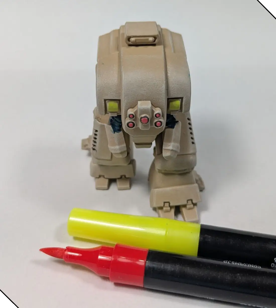 When it comes to painting my armies, I am perhaps the laziest miniature painter in the entire world. I blocked in the basic colors of the lenses, lights, and flexible sections using brush tip acrylic markers. When I’m just using a spot of color, I really enjoy the ease of acrylic markers, but you can create the same effect with a fine tip brush and the yellow, red, and blue/black of your choice.