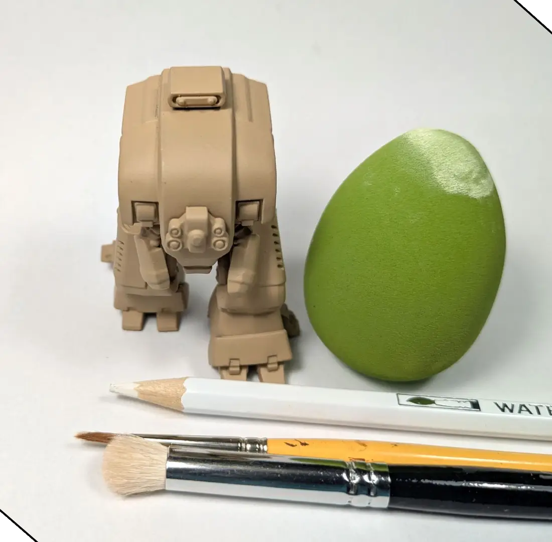 Once the basecoat had fully cured, I used drybrushing to pull out details and lay down soft edges and surface highlights, and then used the edge of a white watercolor pencil to quickly and easily add additional sharp edge highlighting. There are a LOT of ways to drybrush a model, so use whichever you’re most comfortable with, and if you don’t have any watercolor pencils, you can use the edge of your paintbrush to achieve the same result.