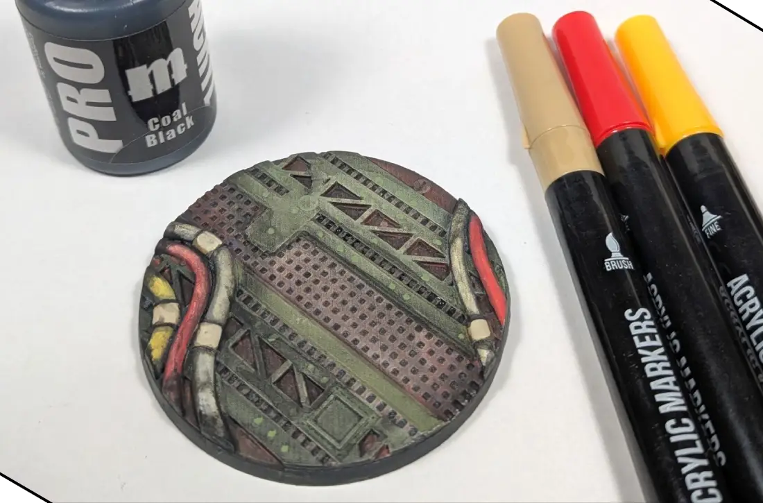 I used red and yellow acrylic brush pens to pick out some of the tubing, and used the tan for the couplings to provide additional color harmony with the model. After that, I applied several layers of Pro Acryl Coal Black wash to the model to create shading and grime.
