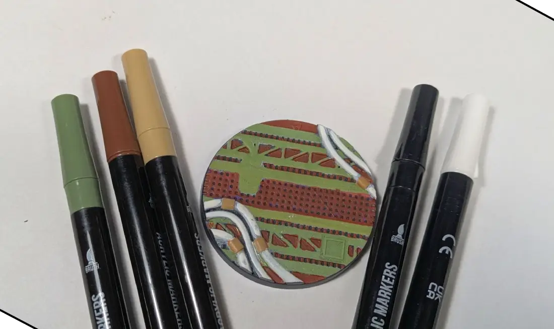 For the base I started with olive, brown, tan, black, and white acrylic brush pens—but any similar colors will work for brush painting. It’s a bit messy, but I’ll make that work for us as I go.